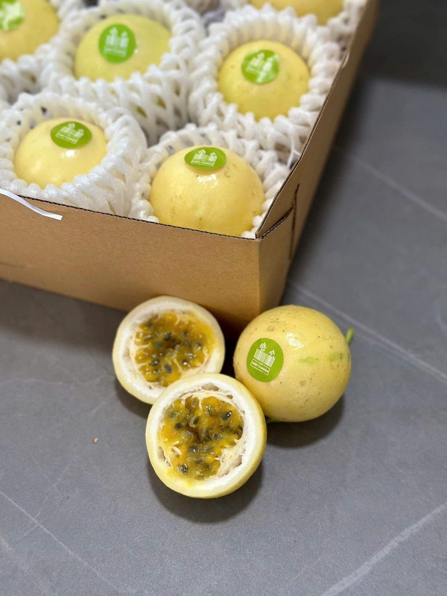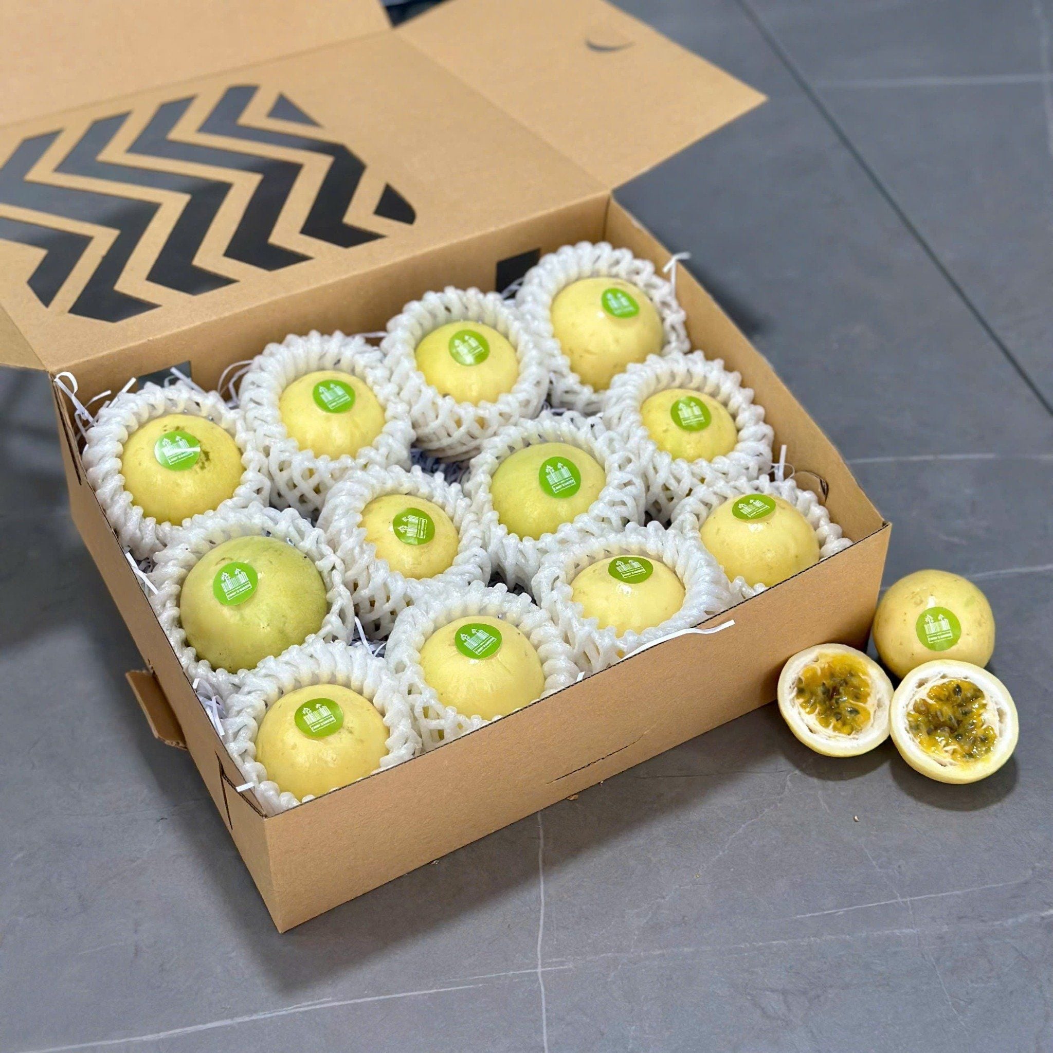 - Trái chanh dây hoàng kim có hình ovan, khi chín có vỏ màu vàng, căng bóng.